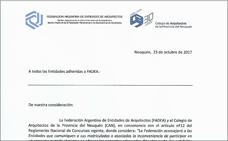 Lamentamos que la bienal de arquitectura apoye un concurso que no esta auspiciado por Fadea, además de no adherir al reglamento nacional de concursos que es la herramienta que garantiza todo el proceso. Por otro lado que que promocione un concurso en la localidad de Añelo sin el auspicio ni ... Leer más