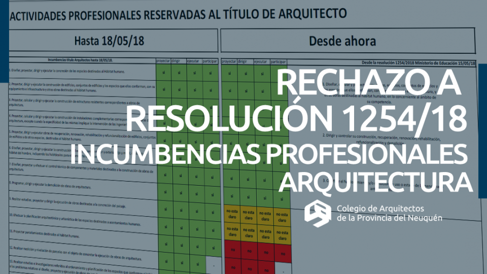 RECHAZO A RESOLUCIÓN 1254/18 INCUMBENCIAS PROFESIONALES Y ACTIVIDADES RESERVADAS A LA ARQUITECTURAEl Consejo Superior del Colegio de Arquitectos de la Provincia del Neuquén (CAN) , en