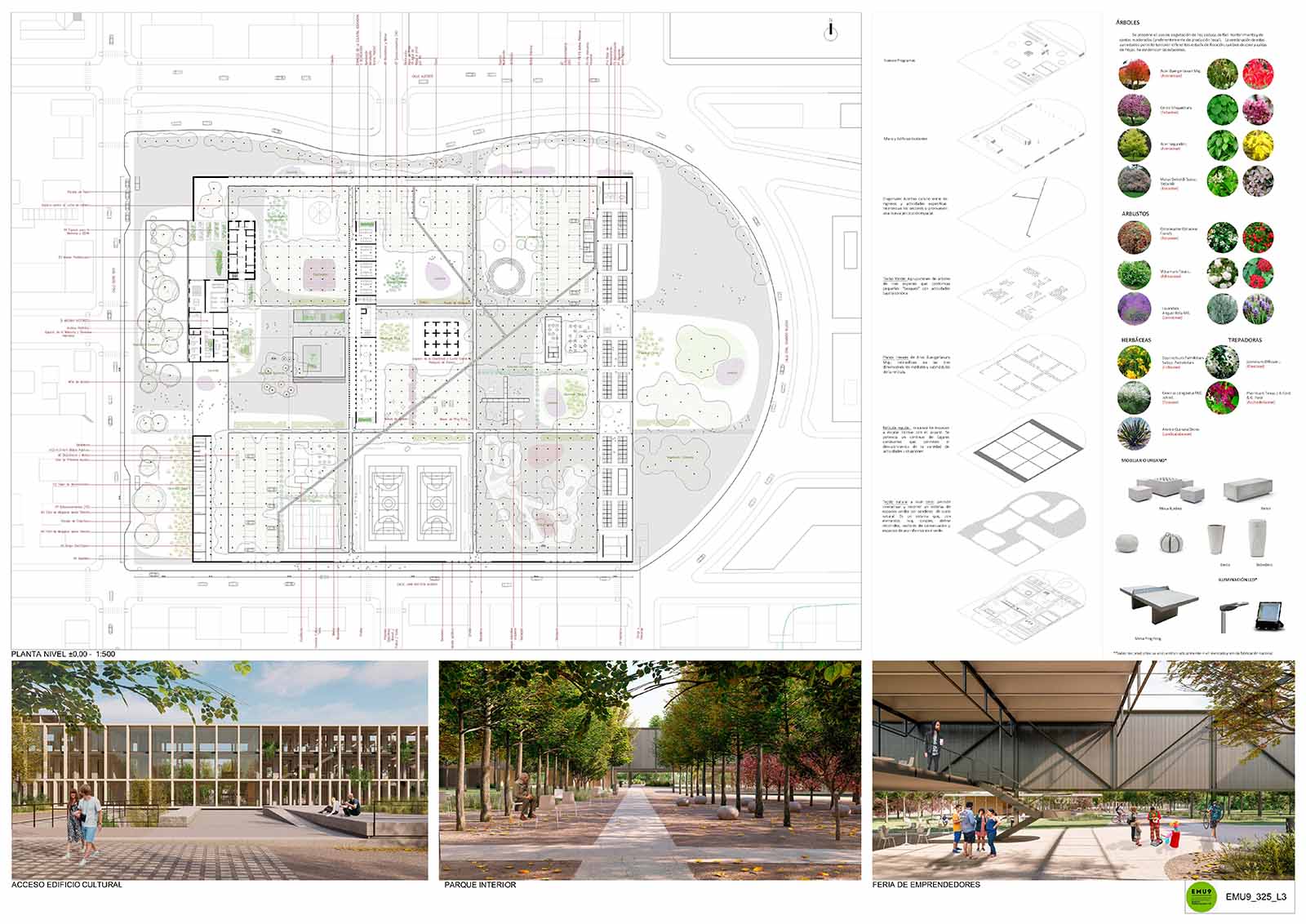 - El nuevo arbolado se plantea en dos sistemas que complementa la vegetación existente: Planos lineales de (Acer Buergerianum Miq.): Intensifican en las tres dimensiones los módulos y submódulos de la retícula. Su trazado es lineal y de separación regular. El techo verde: son pequeñas agrupaciones de árboles de tres especies (Cercis Siliquastrum L., Acer Negundo L. y Malus Sieboldii Subsp. Sieboldii) que conforman pequeños «bosques» con actividades bajo la sombra.