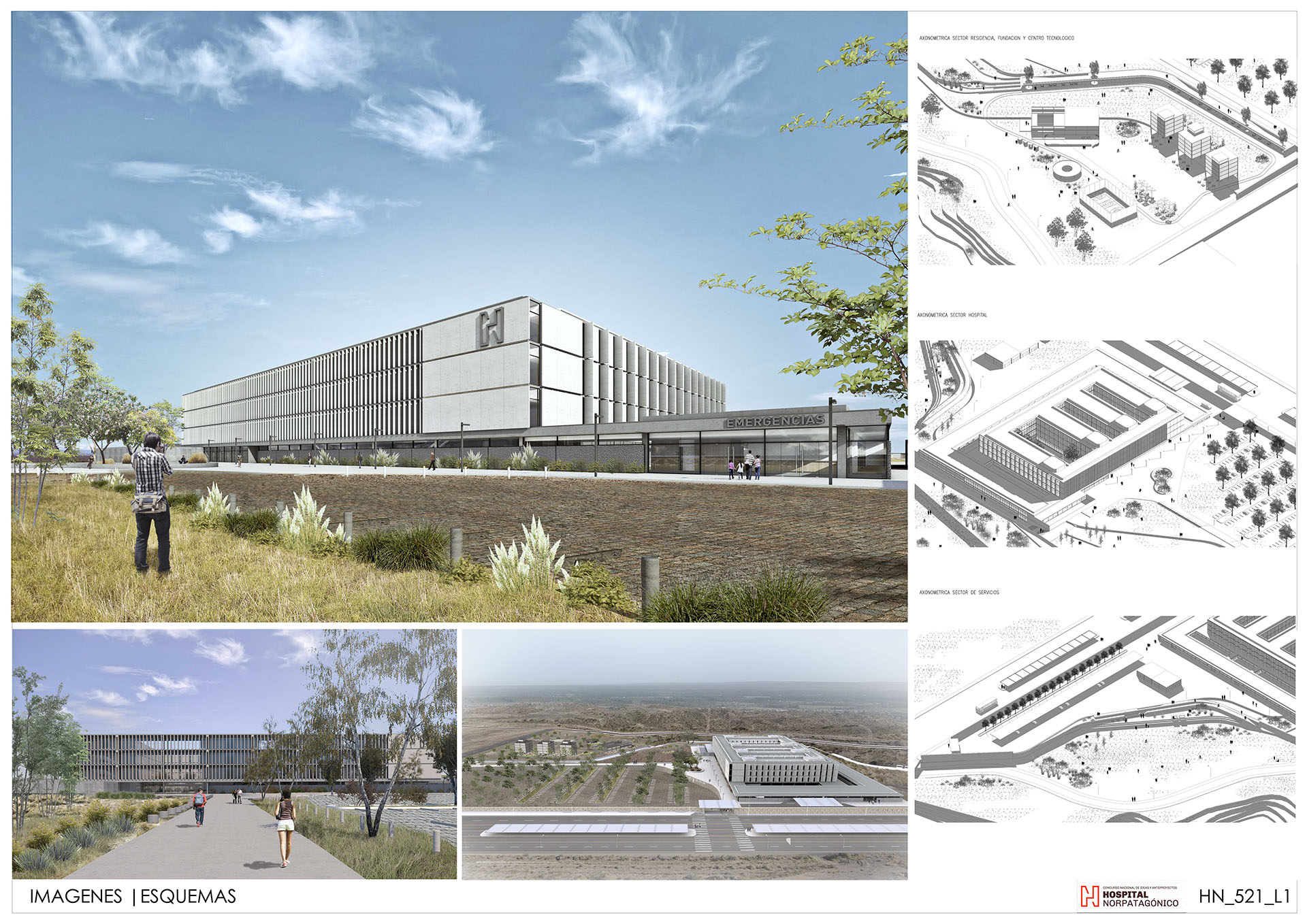 El hospital propiamente dicho ubicado en forma pasante hacia las mejores visuales y orientaciones, conformando junto a la residencia, fundación y centro tecnológico un espacio abierto de usos múltiples que permite albergar actividades recreativas para las personas que se alojen por intervalos reducidos de tiempo o con estadías más largas.