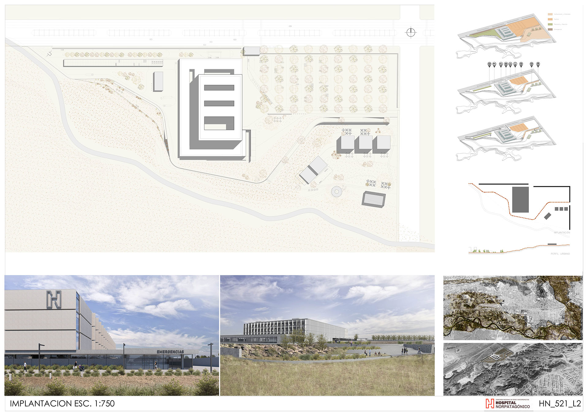 La decisión de operar el terreno en forma perpendicular a la Avenida con mayor flujo se debe a priorizar la accesibilidad al hospital desde el transporte público. Otorgándole de esta forma al peatón largas visuales hacia el valle, y resguardándolo del clima del oeste patagónico.