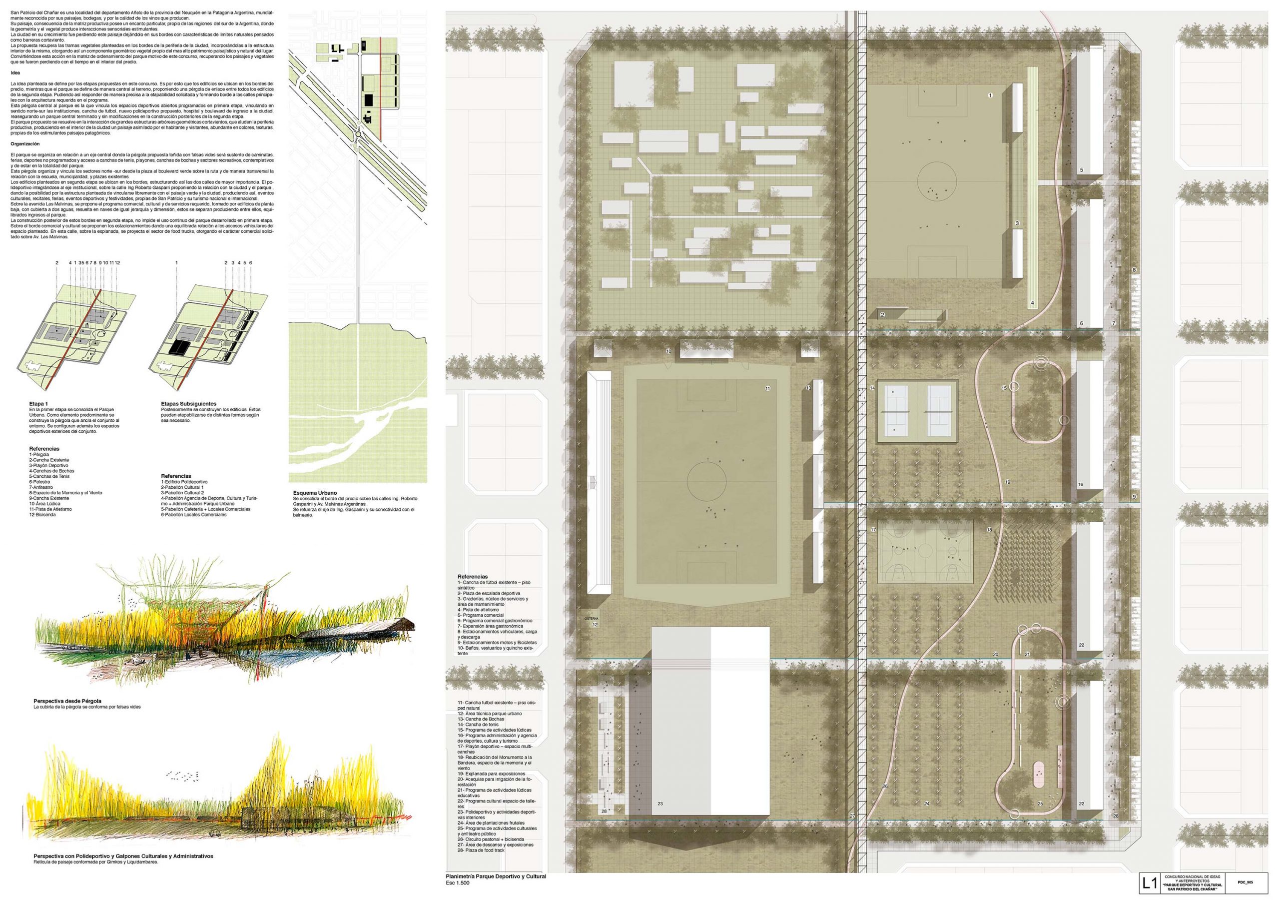 La idea planteada se define por las etapas propuestas en este concurso. Es por esto que los edificios se ubican en los bordes del predio, mientras que el parque se define de manera central al terreno, proponiendo una pérgola de enlace entre todos los edificios de la segunda etapa. Pudiendo así responder de manera precisa a la etapabilidad solicitada y formando borde a las calles principales con la arquitectura requerida en el programa.