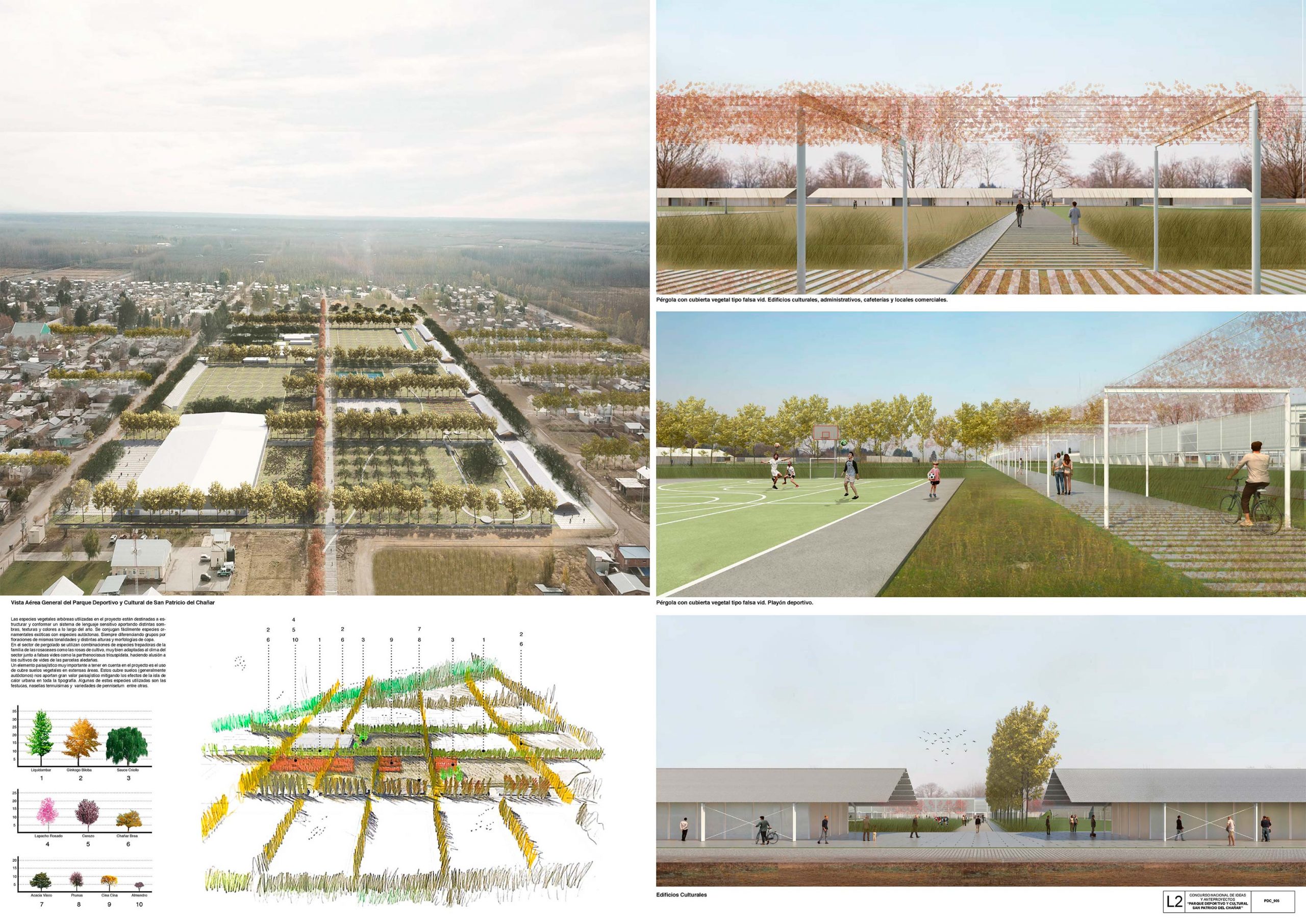 La propuesta recupera las tramas vegetales planteadas en los bordes de la periferia de la ciudad, incorporándolas a la estructura interior de la misma, otorgando así un componente geométrico vegetal propio del más alto patrimonio paisajístico y natural del lugar. Convirtiéndose esta acción en la matriz de ordenamiento del parque motivo de este concurso, recuperando los paisajes y vegetales que se fueron perdiendo con el tiempo en el interior del predio.