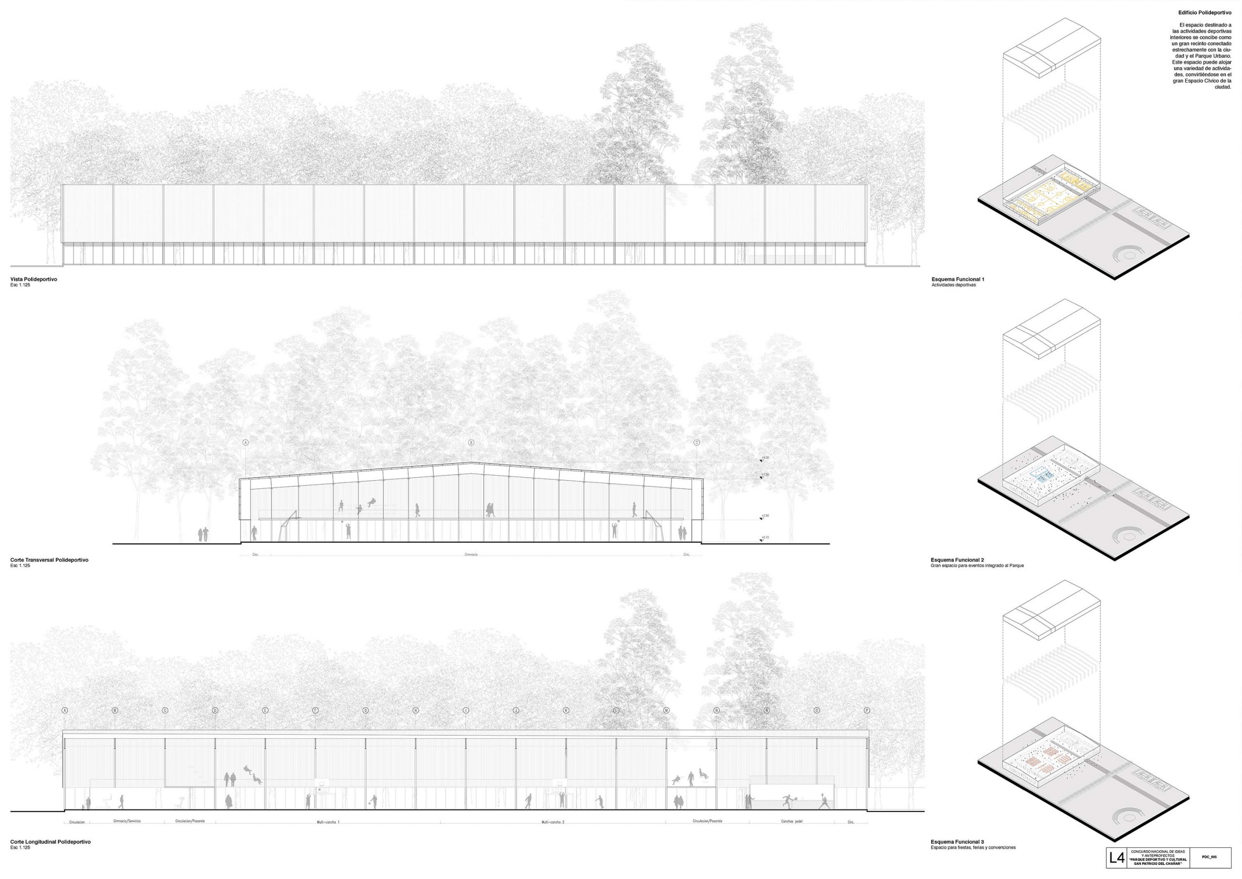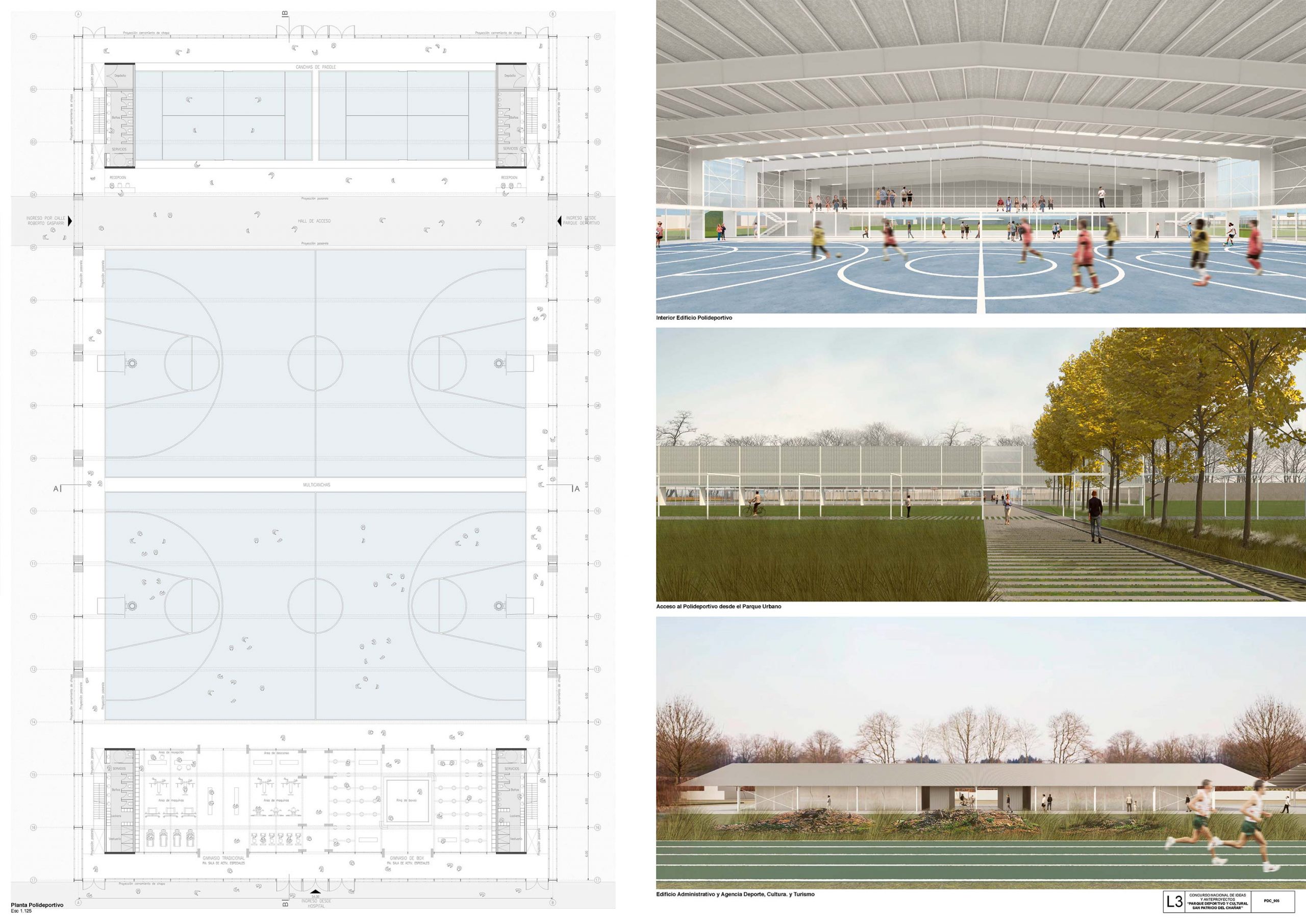 El edificio del polideportivo plantea una nave única a dos aguas que resuelve las multicanchas, gimnasio, box, canchas de paddle, salones de danza, todo resuelto en un espacio único, flexible y totalmente vinculado al paisaje, donde las actividades a plantearse pueden ser variadas. Se conforma con una estructura simple a dos aguas, resuelta con pórticos metálicos de perfiles de alma llena, provocando una imagen sobria y sin estridencias.