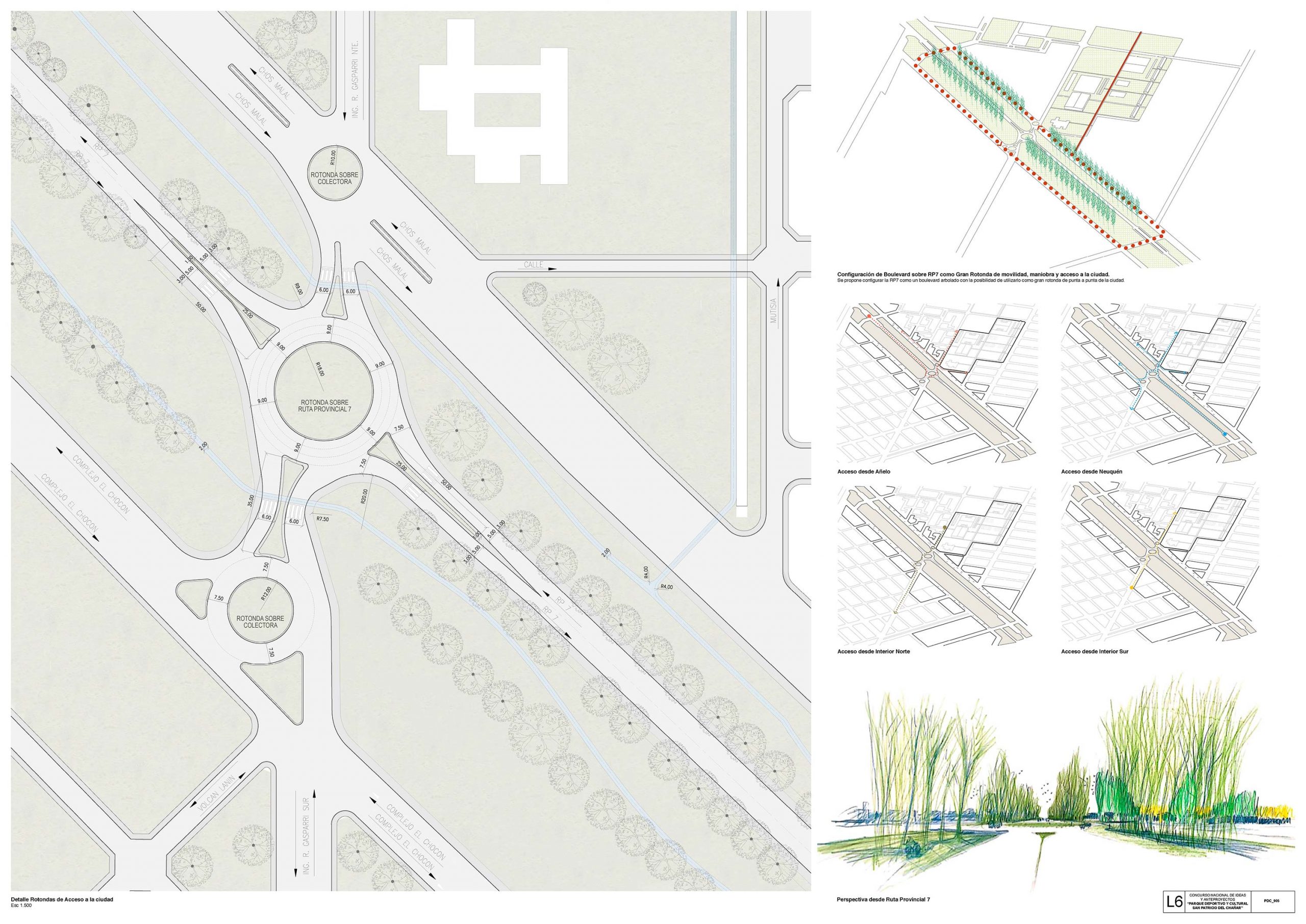 El jurado valora el planteo del proyecto, que se organiza a partir del reconocimiento de matriz productiva expresada en la trama vegetal de los bordes de la ciudad, incorporando a la estructura interior de la misma, otorgando así un componente geométrico vegetal propio del más alto patrimonio paisajístico y natural del lugar.